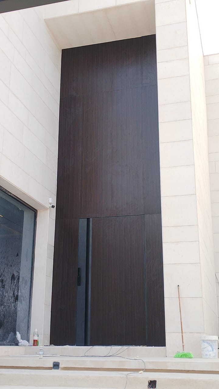 هذا الباب يتميز بتصميم أنيق وعصري يجمع بين الإطار المعدني البنى اللامع وبين لوح داخلي بخامة حجرية أو خامة معالجة تشبه الحجر الطبيعي باللون الرمادي الداكن. مزيج الألوان بين الأسود والرمادي يخلق توازن بصري فخم يعكس قوة التصميم ورقيه.