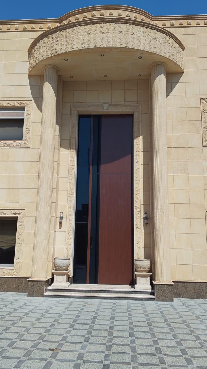 التصميم: الباب طويل جدًا ليواكب الواجهة الفاخرة، ويمنح المدخل إحساسًا بالهيبة والفخامة.
