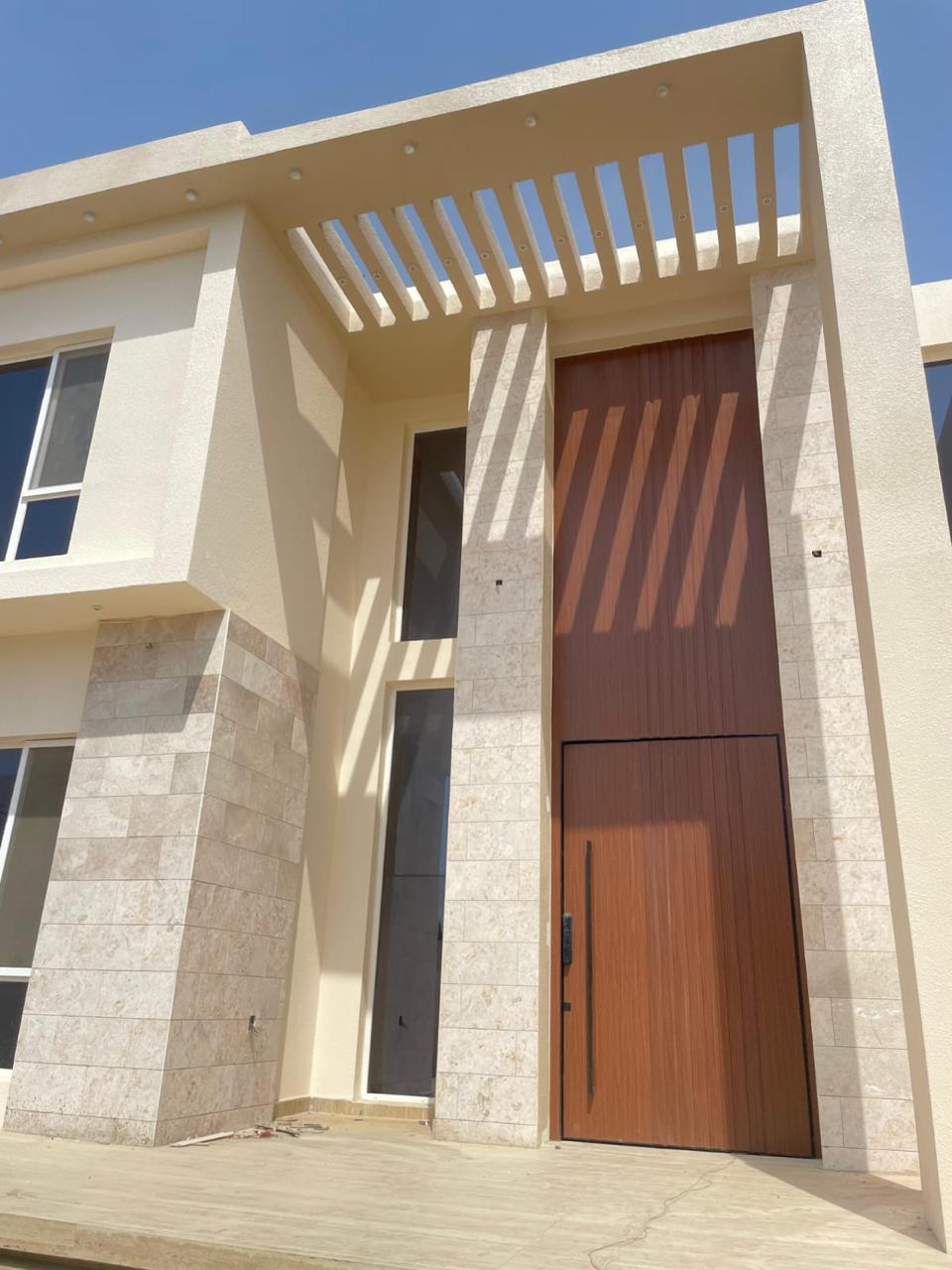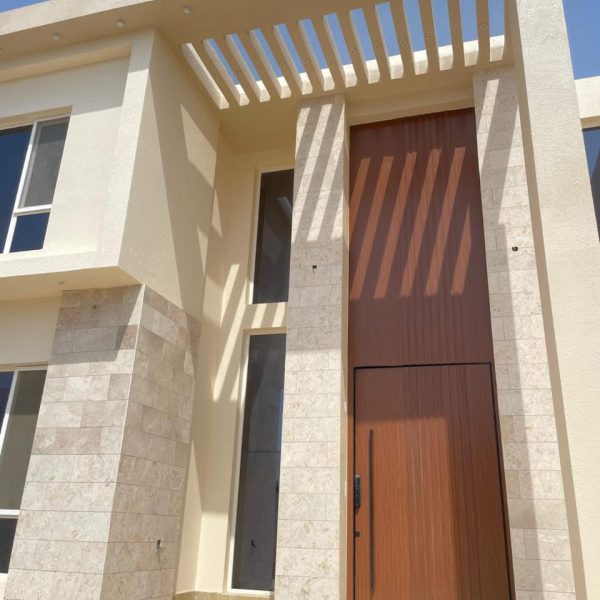 تكامل مع الواجهة: اللون الخشبي الدافئ يتناسق مع ألوان الحجر والدهانات الخارجية.